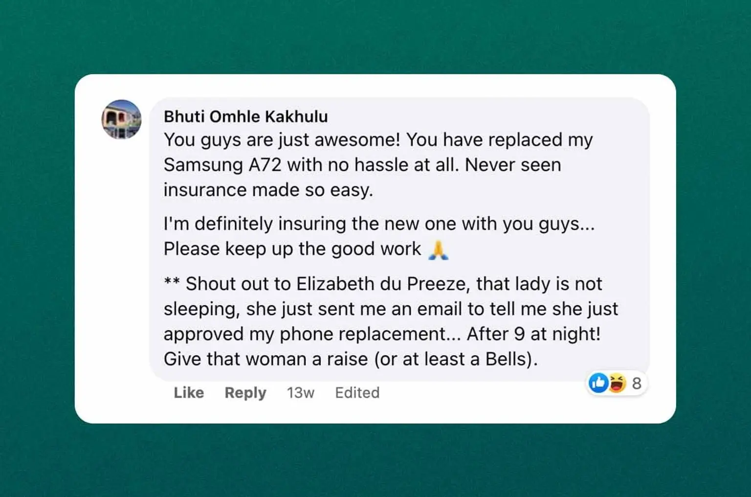 We love seeing our amazing help desk crew getting shoutouts from customers, because that tells us that they are making a good impression. This comment from Bhuti came through via Facebook with a personal big-up for Elizabeth for sorting a claim after 9pm. What can we say, we love what we do!