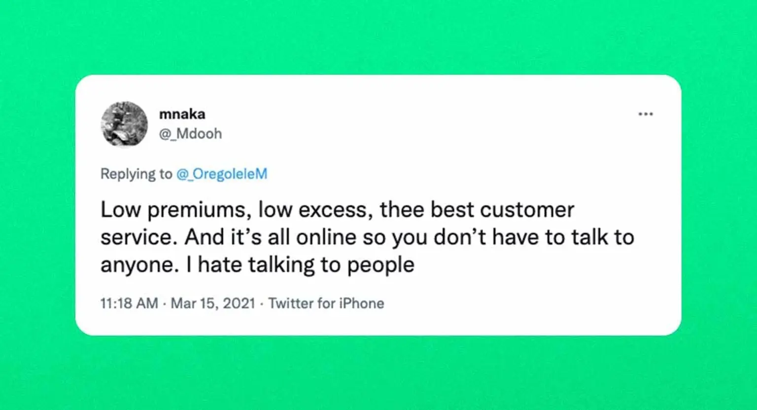 A good review tells a story. This classic review from @_Mdooh starts like any other review, he mentions the low premiums and excess, gives our excellent Helpdesk a well-deserved shoutout and even mentions that Naked is all online. But then the review takes a wild turn when he ends it with ‘I hate talking to people’. Ok, Mdooh we need answers. Is it all people? On the phone or just in general? What do you do at the drive-thru? Did something happen? Talk to us. Wait let me guess, you don’t want to talk about it?