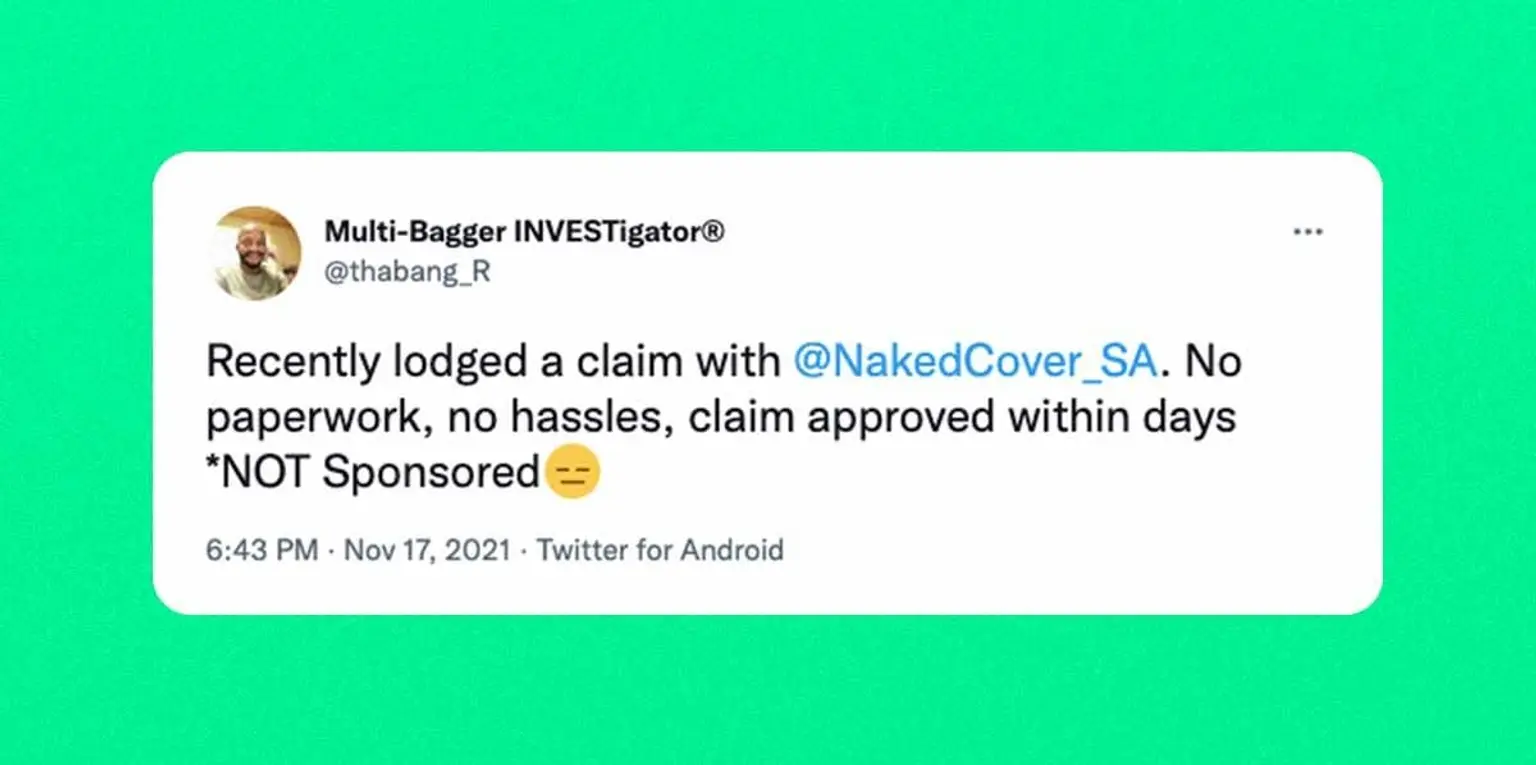 Here’s something we love to see, the words “not sponsored”. In this age of influencer marketing and sponsored content, it’s almost impossible to know who you can trust anymore. Twitter user @Thabang_R knows that his followers might be a little sceptical that he is suddenly singing an insurance app’s praises online, so he makes sure everyone understands that this shoutout is not the product of a multimillion-rand endorsement deal.