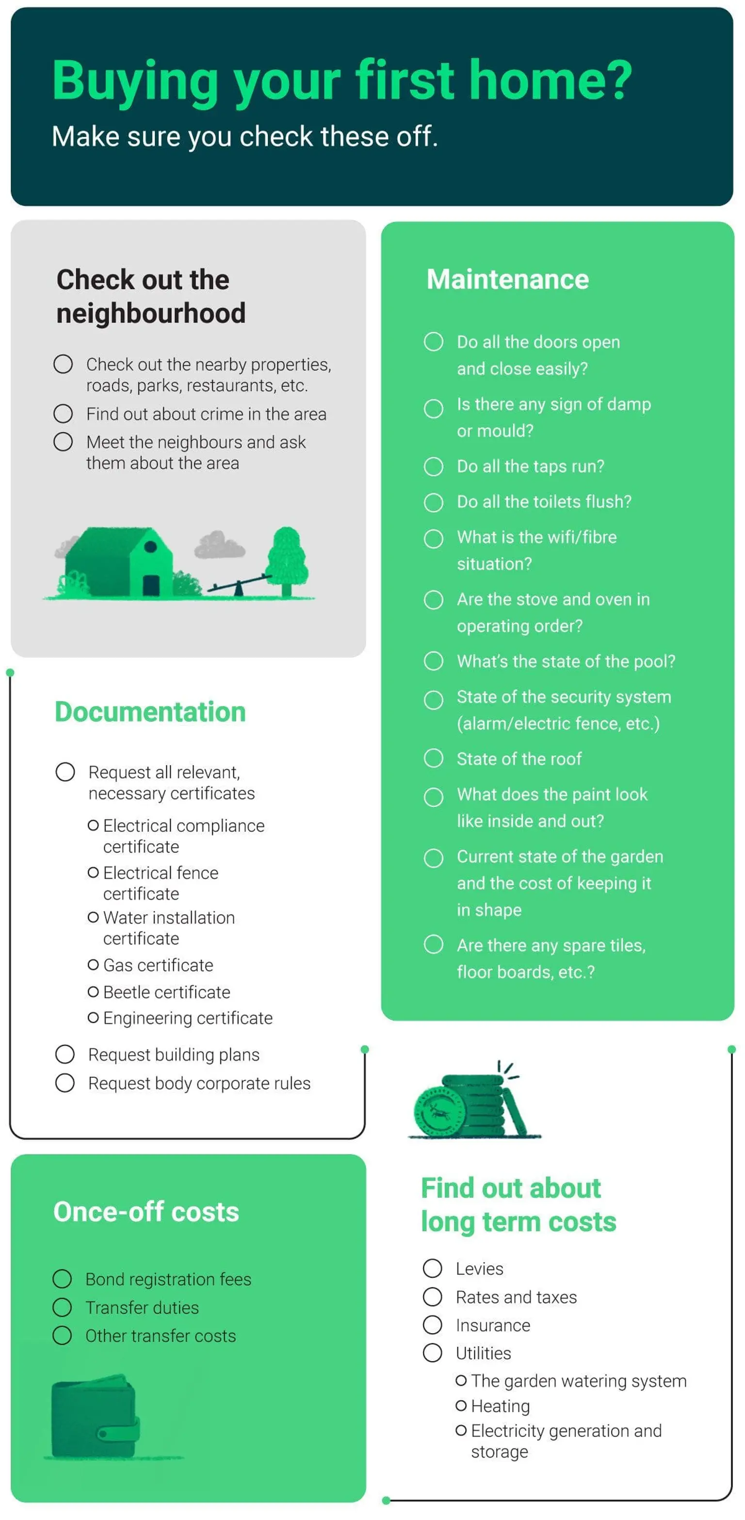 If you’re buying a home that’s in a complex or development, you usually have to pay a monthly levy. Find this out so you can know what to expect each month. It might be a good idea to compare one complex’s levies with another.