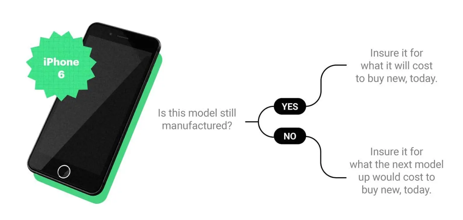 Most insurers insure your items as “new for old”. For example, if you want to insure your iPhone 8, you will need to insure it for the price that it costs to buy new today – not what it would’ve cost you three years ago and not what a three-year-old iPhone 8 would cost you today. This is known as replacement value.