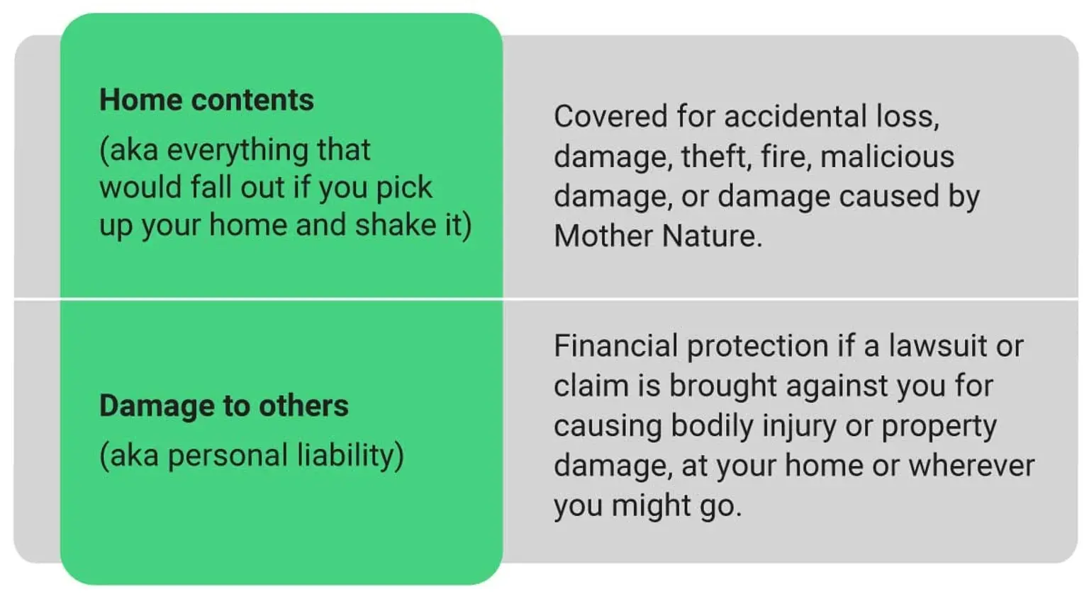 Home contents insurance will pay for the accidental damage, loss or theft of your things while they are at home. Some contents policies will also cover your things when taken out of your home. Lastly, your contents insurance gives you financial protection if you are held legally responsible for causing either bodily injury to someone or damage to their property.