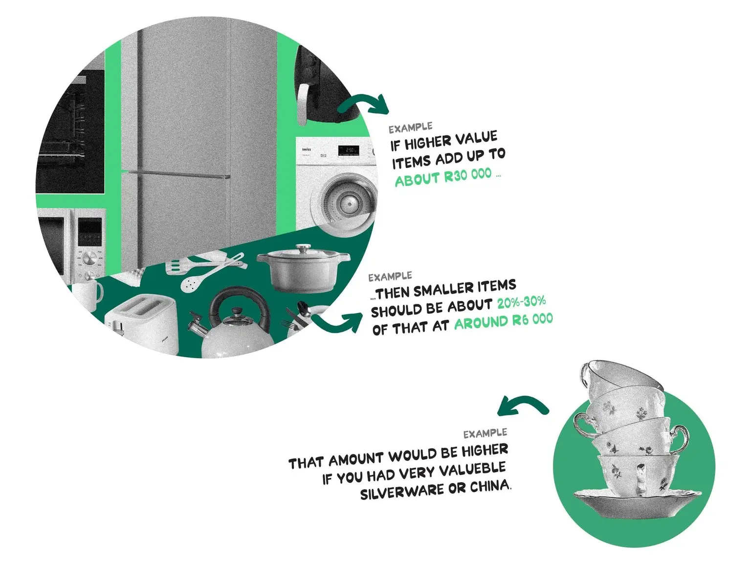 It’s not always easy to place a value on the smaller items you’ve collected over time. Once you have found the replacement value of the higher-value items, add those values up so that you have a separate amount for each room. As a rule of thumb, the smaller items in that room should be valued at 20-30% of the higher-value items. For example, let’s say the higher-value items in your kitchen (the fridge, microwave, washing machine and dishwasher) add up to R30,000. The smaller items in your kitchen should be valued at least around R6,000. But if you have very valuable silverware and china, this would be a much higher amount.