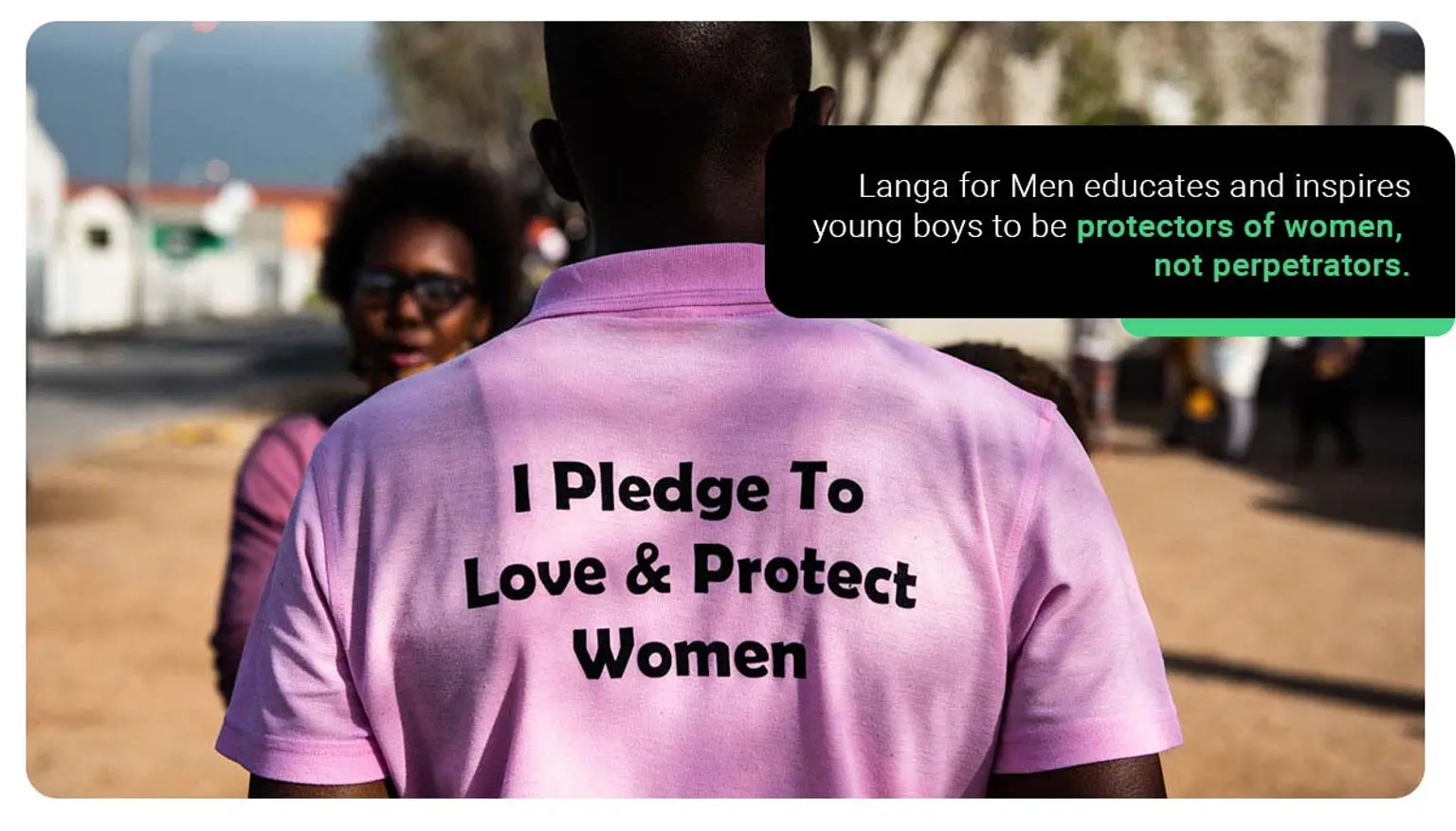 Founded by Luyola and Siyabonga, residents of Langa township in Cape Town, Langa for Men educates and inspires young boys to be protectors of women, not perpetrators. They understand that Gender-Based Violence (GBV) starts and ends with men. They have also started a community kitchen and soccer team.