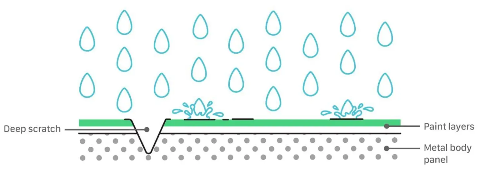 The paint on your car keeps elements like rain, hail, and dirt from compromising the quality of the metal underneath. Scratches create weak points in your car’s paintwork. This means that it’s possible for moisture to build up, making your car more susceptible to rust. Dents can also increase the risk of rust and corrosion – often posing an even higher risk than scratches, as they typically expose a larger surface area to moisture.