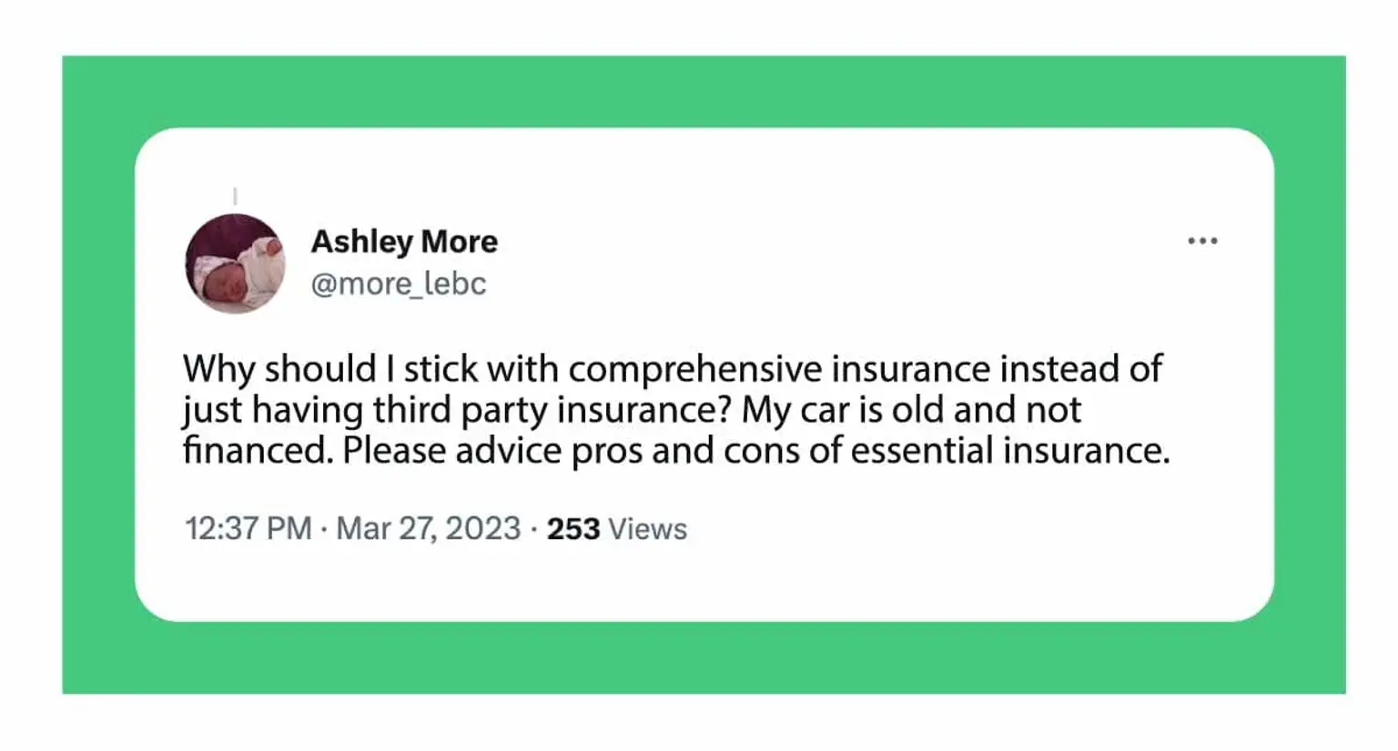A: The truth is, it's totally up to you and your situation. If you're not too worried about being stuck with a huge bill if your car gets totalled, then maybe you don't need comprehensive coverage. But if you're driving around in constant fear of crashing into a fancy R3 Million Range Rover and getting sued for damages, then third-party liability might be more up your alley.